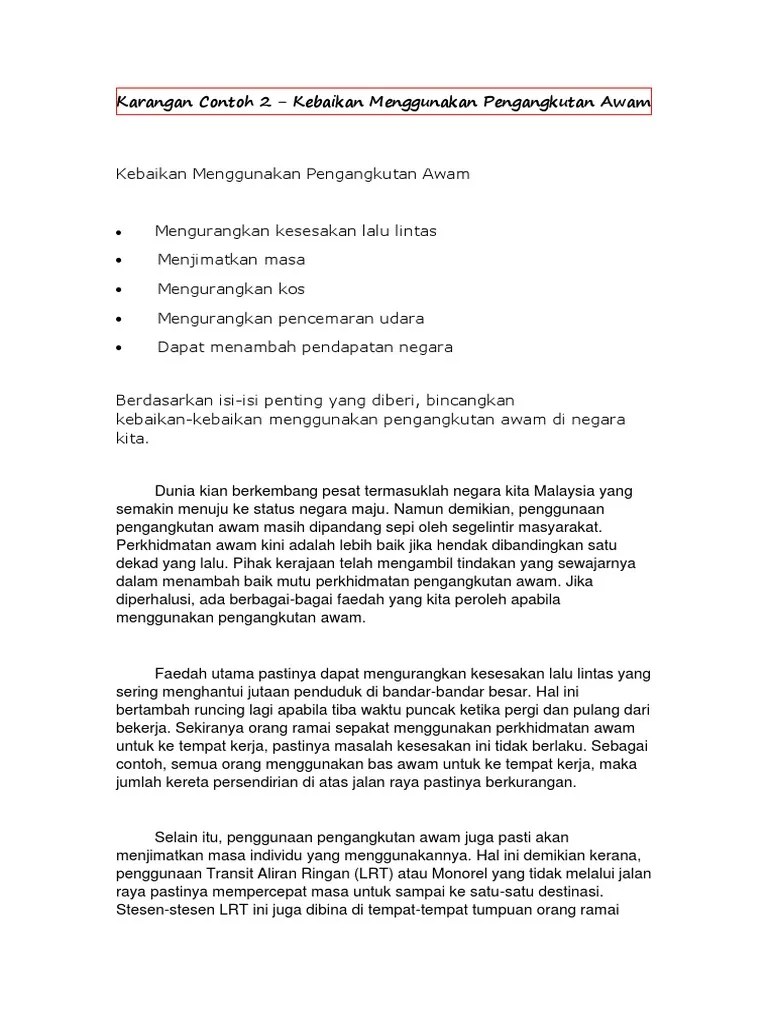 Usaha menaik taraf sistem pengangkutan awam negara memberikan banyak manfaat kepada masyarakat. Pengangkutan awam ini dapat memberikan pelbagai kemudahan kepada semua orang. Pengangkutan awam merujuk pada kenderaan perkhidmatan awam, yang digunakan untuk mengangkut penumpang, dan dibayar sejumlah wang . You can also bookmark this page with the url . Perkhidmatan awam kini adalah lebih baik jika hendak dibandingkan . Karangan spm kepentingan pengangkutan alaf . Contoh karangan isi & huraian/kembangan isi bahasa melayu spm (sukatan ting 5). Karangan cemerlang pelajar tahap spm. Sumber rujukan bagi membantu para pelajar dalam penulisan esei. Pengangkutan alaf ini (buku teks tingkatan 5, m.s. Pengangkutan awam (berdasarkan buku teks tingkatan 5). Karangan spm 2020 diperhalusi untuk perbincangan:
